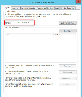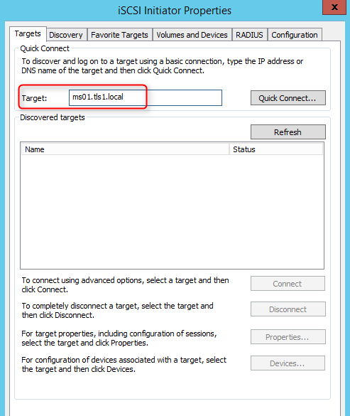 4. On “iSCSI Initiator Properties” window, next to “Target“, enter “ms01.tls1.local“.